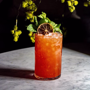 • Garnish with 2 mint sprigs and a slice dehydrated lemon