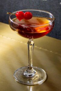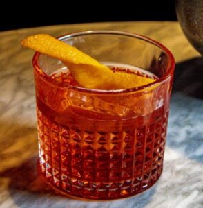 • Garnish with an orange peel and maraschino cherry