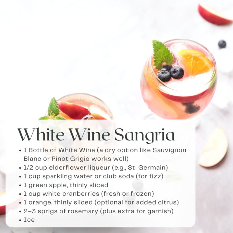 The Winter White Sangria is a delightful and elegant holiday cocktail, perfect for bringing a touch of brightness to your festive gatherings. Made with crisp white wine, a hint of floral elderflower liqueur, and sparkling water for a refreshing fizz, this sangria is elevated with seasonal fruits like green apple slices, cranberries, and sprigs of aromatic rosemary. Its light, citrusy flavor profile and snowy aesthetic evoke the magic of winter, while the vibrant fruit and rosemary garnish add a festive flair. Easy to prepare in advance, this versatile cocktail pairs beautifully with holiday meals and appetizers, making it an ideal choice for entertaining. With its balance of sophistication and holiday charm, Winter White Sangria is sure to be a crowd-pleaser!
