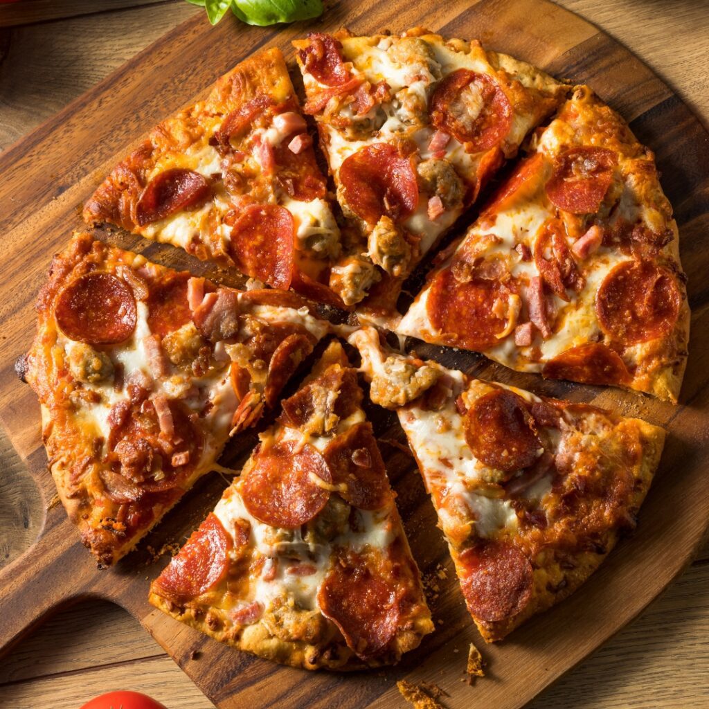 A meat lovers pizza, loaded with sausage, ham, bacon, and pepperoni, needs a powerful wine to balance the bold, savory flavors. This pizza is rich and hearty, making it perfect for cooler fall evenings.