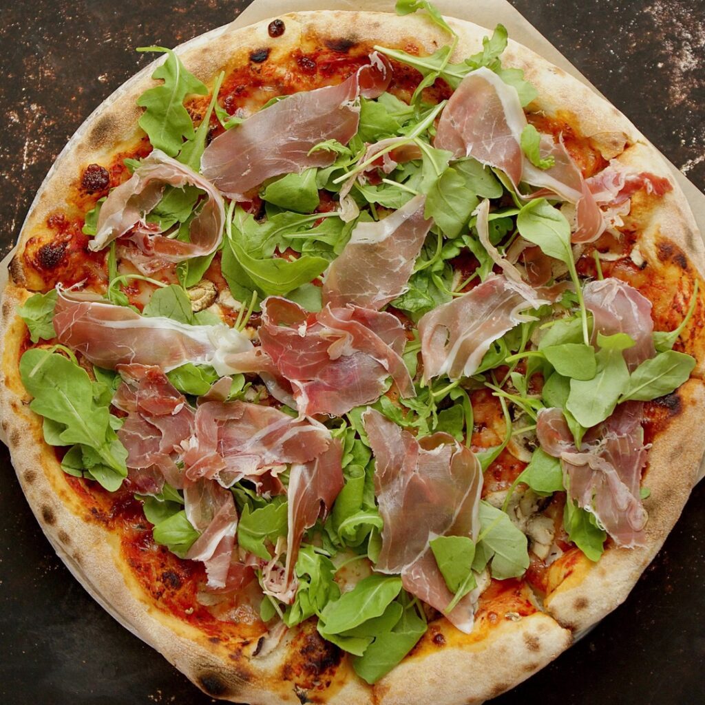 A Prosciutto Arugula pizza is a beautiful blend of savory prosciutto, fresh arugula, and a light sprinkle of Parmesan, offering a mix of salty, bitter, and peppery flavors. This pizza calls for a wine that is equally light and versatile.